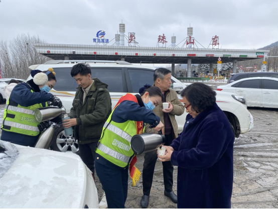 (灵珠山东收费站为司乘人员提供热水)