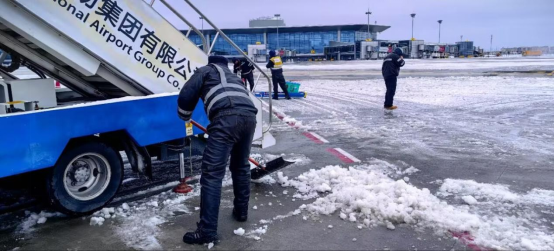 近日,青岛胶东国际机场迎来大雪,地面形成的积冰对出港航班造成了一定影响。青岛航空机务工程部团员青年根据机位放行人员报告,积极发挥先行军作用,第一时间组织人手前往航前出航飞机所在机位进行地面扫雪及除冰工作,有力保障了公司青岛出港及落地航班的正常运行。