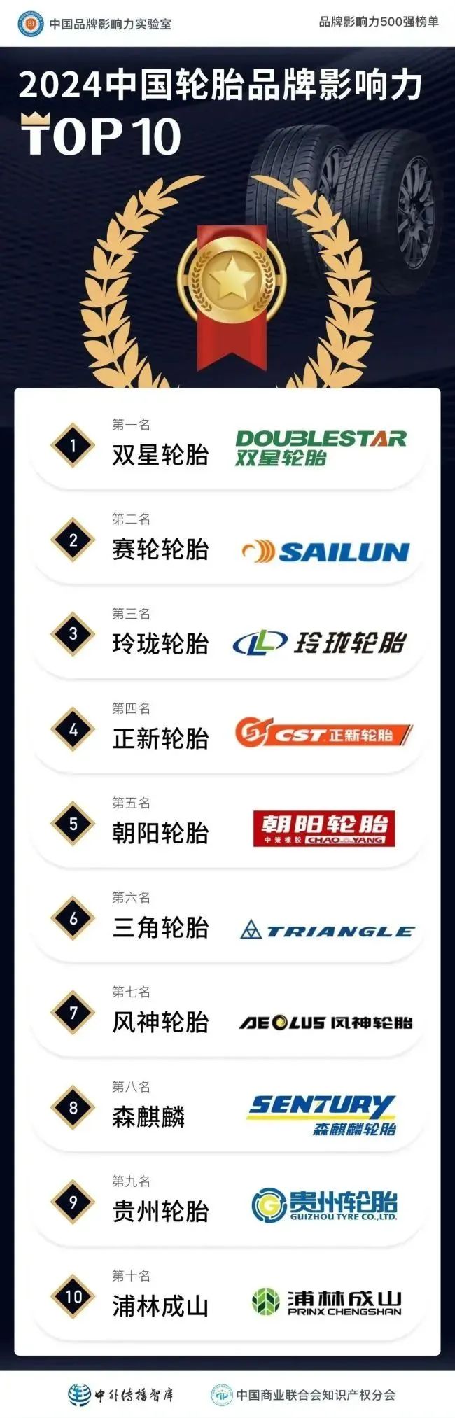 近日,世研指数联合中国品牌影响力实验室、中外传播智库和中国商业联合会知识产权分会共同发布《2024最具影响力轮胎品牌指数报告》,“双星轮胎”被评为2024中国轮胎品牌影响力第一名。