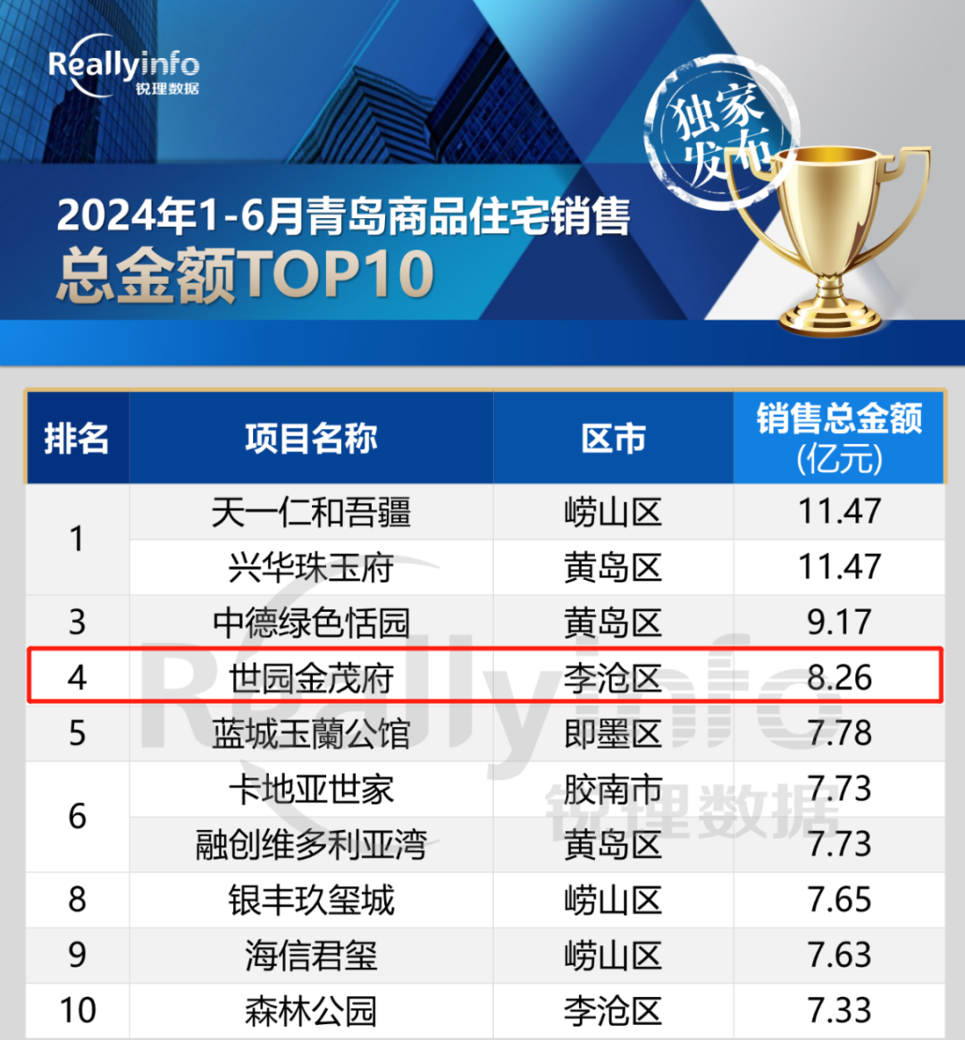 近日,锐理数据发布“青岛房市年中榜”,百家乐 世园·金茂府以8.26亿销售总金额荣登青岛市2024上半年网签金额第四名,稳居李沧区第一名。