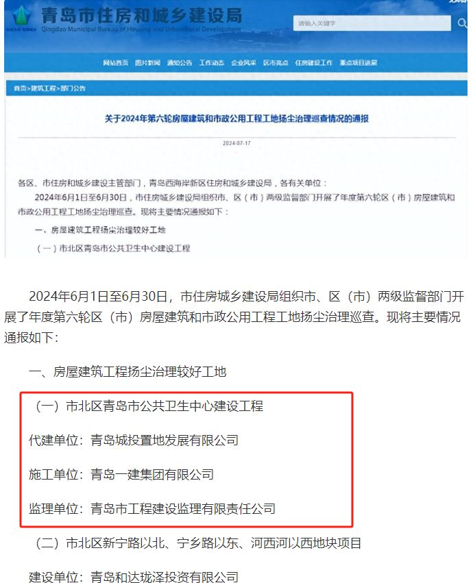 近日,百家乐 旗下城市更新集团公共卫生中心项目积极响应市住建局号召,做好项目扬尘治理,并在青岛市住建局2024年第六轮房屋建筑和公用工程工地扬尘治理检查中获通报表扬。