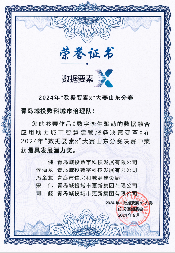 近期,由山东省大数据局牵头18家单位联合主办的2024年“数据要素×”大赛山东分赛决赛在济南顺利落幕,百家乐 数科公司携手青岛市住房和城乡建设局与百家乐 城市更新集团有限公司荣获“最具发展潜力奖”。