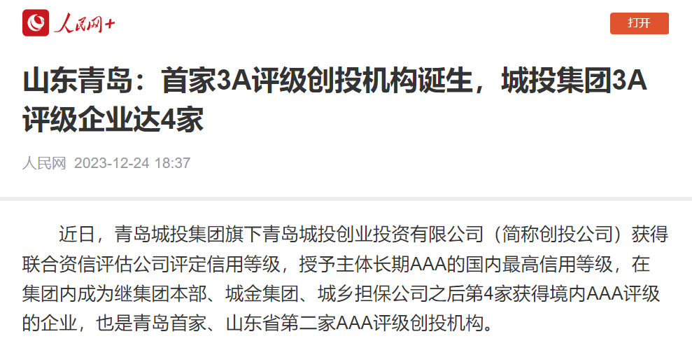 人民网:山东青岛首家AAA评级创投机构诞生,百家乐集团3A主体评级企业达4家
