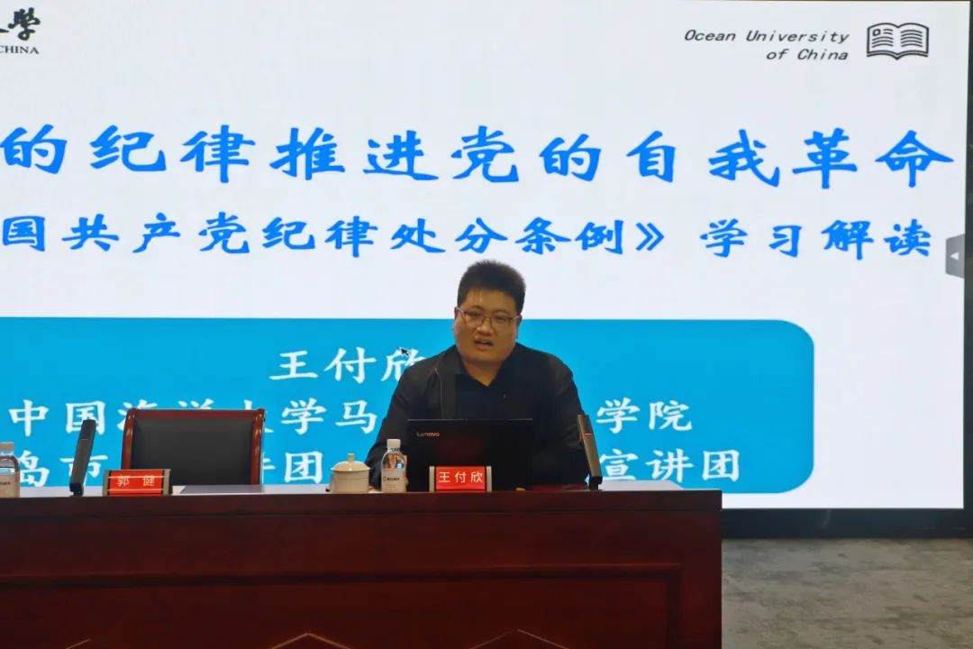 会议邀请中国海洋大学马克思主义学院党委副书记、副院长王付欣教授围绕“学《条例》守党纪、以严明的纪律推进党的自我革命”主题作辅导报告。报告紧扣党中央关于党的纪律建设的总体要求,将习近平总书记关于党的纪律建设的重要讲话、重要指示精神与《条例》贯通起来解读,结合党史学习教育,联系世情、国情、党情,深入阐释了开展党纪学习教育的重大意义、新修订《条例》的原则理念和主旨要义,并对《条例》的突出特点和重点内容进行了梳理分析,引导党员干部准确全面把握《条例》的丰富内涵和实践要求,更好地学纪、知纪、明纪、守纪。