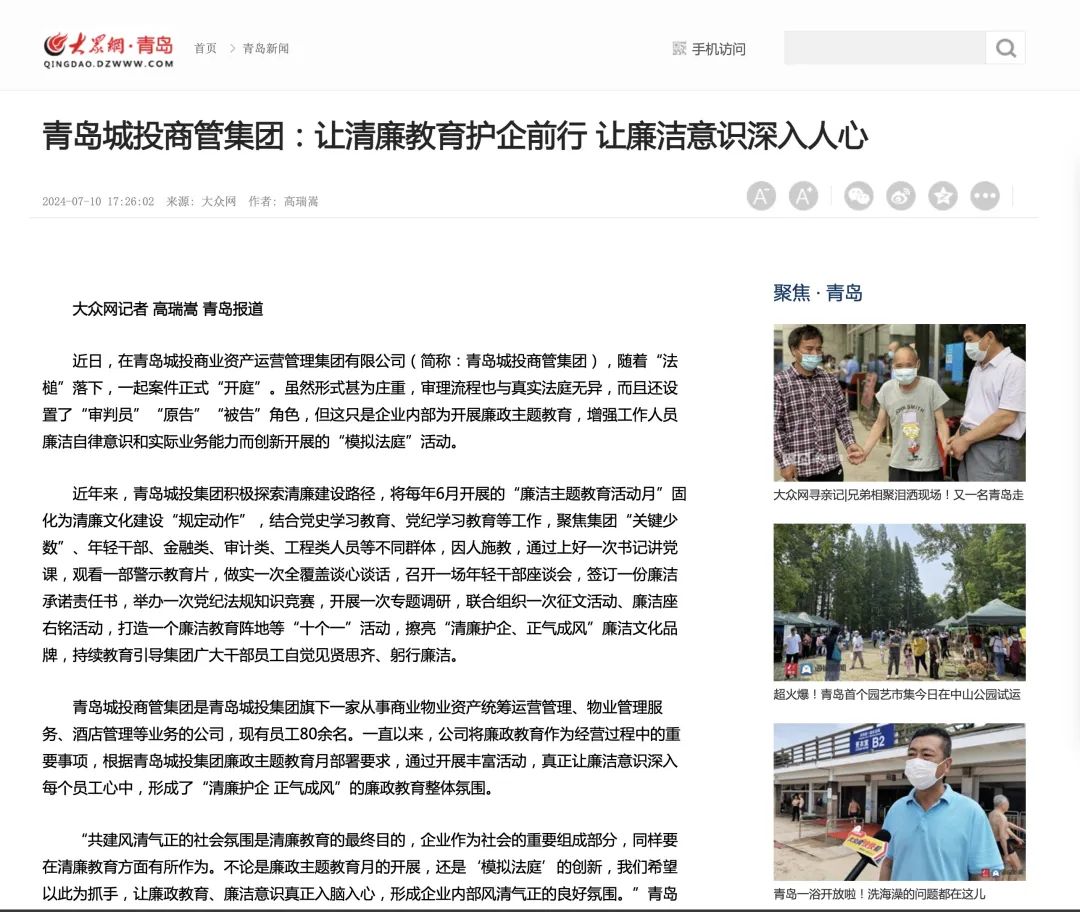 大众网:百家乐 商管集团让清廉教育护企前行 让廉洁意识深入人心