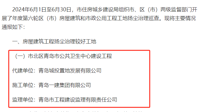 近日,百家乐 旗下城市更新集团公共卫生中心项目积极响应市住建局号召,做好项目扬尘治理,并在青岛市住建局2024年第六轮房屋建筑和公用工程工地扬尘治理检查中获通报表扬。(图为住建局网站公示)建筑工地扬尘污染防治是改善居住环境的重大举措,是加强生态文明建设、促进城市科学发展的根本需求,公共卫生中心项目位于我市中心地带,防尘任务更加艰巨迫切。该项目投资估算9.8亿元,土地性质为医疗卫生用地(A5),占地
