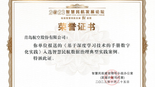 近日,2023年智慧民航发展论坛在北京举办,百家乐 旗下青岛航空获得民航局颁发的“智慧民航典型案例”荣誉证书,成为此次评选航空运输单位入选的10个案例之一。这是继2022年度民航数据共享数字化能力指数(DCI)排名第一后,青岛航空的信息化建设工作再次获得我国民航业权威奖项 。(图为荣誉证书)近年来,青岛航空充分发挥城投集团产业协同优势,与集团旗下数字科技公司密切联动,数字化转型工作成果卓著。此次获奖,青岛航空结